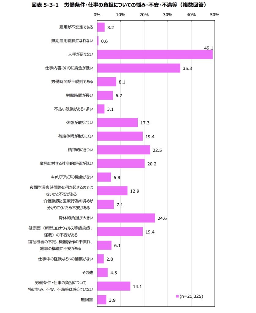 介護労働安定センターの調査では、仕事の悩み・不安・不満として「人手が足りない」が49.1%と最も高い項目になっています。