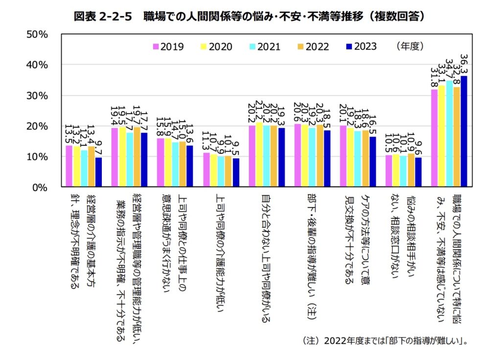 介護労働安定センターの調査では、人間関係の悩みとして「自分と合わない上司や同僚がいる」が19.3%、「経営層や管理職等の管理能力が低い、業務の指示が不明確・不十分」が17.7%などが挙がっています。