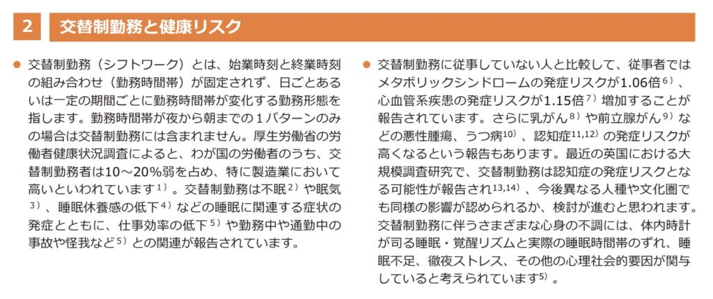 現場では起きがちですが、体への負担が大きくなりやすい組み方です。夜勤は睡眠と体内時計を乱しやすく、事故やエラーのリスクも上がりやすいとされます。